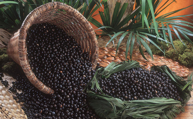Açaí fruit (pronounced ah-sigh-ee) is deep purple in color and is roughly the same size and appearance as a grape. Fruit can be eaten raw or processed into juice, smoothies, or the popular acai bowl. One tree can grow up to 90 ft tall and produce thousands of berries in a season.